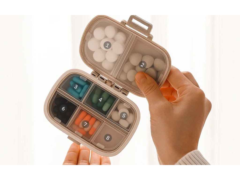 Praktický a elegantní organizér na kapsle a pilulky, navržený pro každodenní používání doma i na cestách. Obsahuje 8 samostatných přihrádek, které pohodlně pojmou různé velikosti doplňků stravy, vitamínů i kapslí.