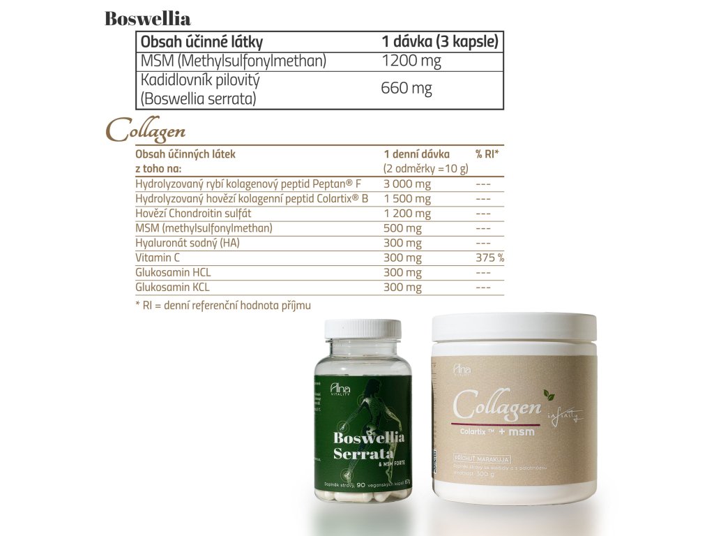- Hydratace: Kyselina hyaluronová zajišťuje vlhkost pro klouby i pleť