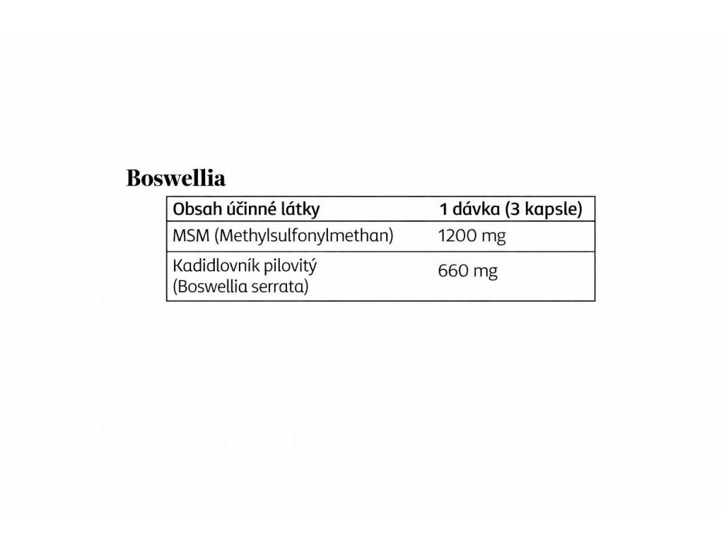- Extrakt z Boswellia serrata (65 % kyseliny boswelliové): 660 mg